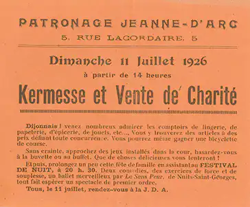 Le calme revient progressivement, et arrive la guerre de 14-18 avec d’autres préoccupations. Une fois la paix revenue, les autorités religieuses ne vont pas manquer de s’apercevoir que les ministres du culte ne sont plus payés par l’Etat. Il faut donc trouver des fonds, créer des structures pour accueillir les jeunes enfants, inventer de nouvelles pistes afin de transmettre la foi. C’est là l’origine des patronages gérés par les curés et les vicaires des paroisses, tout comme des associations qui les accompagnent. Ils auront leur siège au 5 rue Lacordaire. Par ce biais, les catholoques œuvreront pour le développement des activités ludiques, l’éducation physique et morale. Il s’agit de contrebalancer les organisations de scouts implantées dans d’autres religions, dont le protestantisme. Ces patronages vont s’allier à ceux de régions voisines pour monter des spectacles les plus attractifs possibles. A ces patronages, le clergé adjoindra les activités militantes de la J.O.C (Jeunesse ouvrière catholique).
