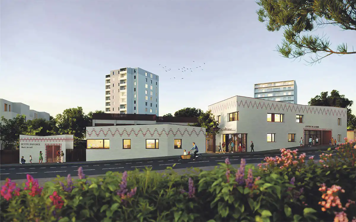 « C’est le cabinet Wild Architecture qui a travaillé sur une réorganisation des espaces existants avec des extensions du site jusqu’en bordure de la rue Louis Jouvet : aménagement d’un front bâti sur la rue générant une nouvelle identité, accès clairs et distincts de chaque entité avec des entrées sous forme de porches, création d’un îlot intérieur partagé et végétalisé avec espaces de jeux.