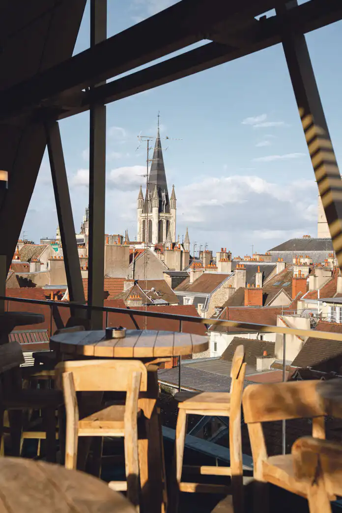 Les deux amis de toujours le déclarent sans ambages : « Limiter Dijon aux arts de la table, c’est passer à côté du charme de son architecture rappelant un passé médiéval, de ses édifices majestueux tels que le Palais des Ducs de Bourgogne et la Cathédrale Saint-Bénigne, de son dédale de rues pavées… ». Avec ce rooftop, l’association est réussie tellement la vue est à couper le souffle depuis les toits du centre Dauphine.